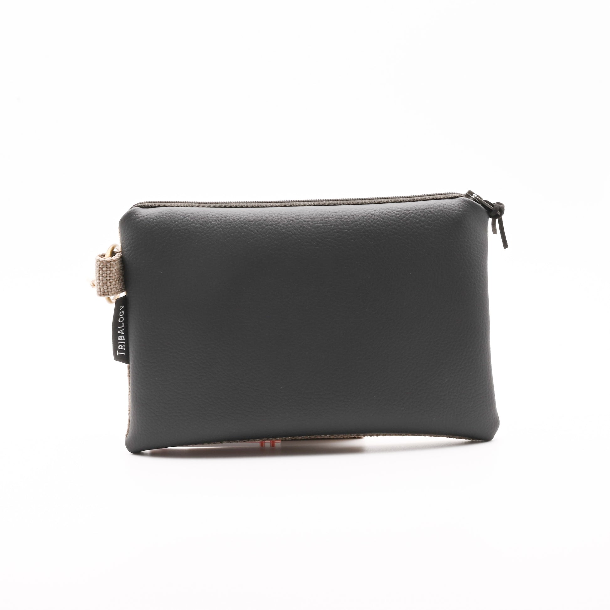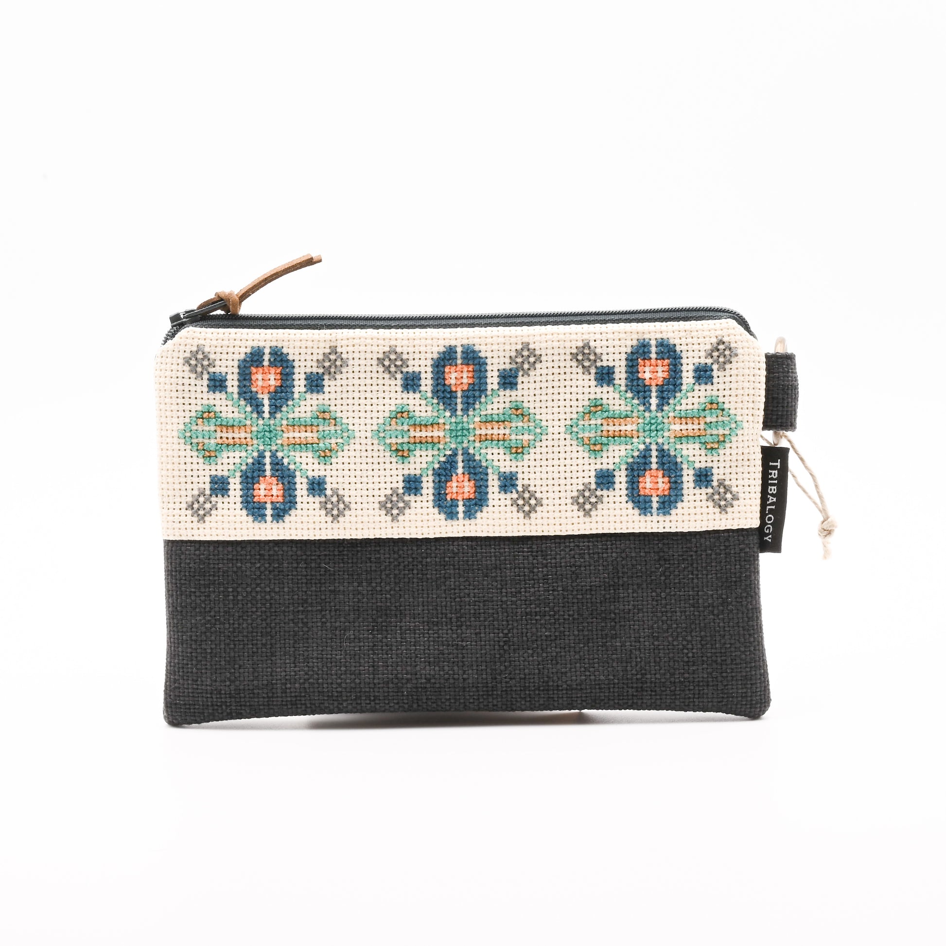 A purse made of hand embroidered Palestinian design with a traditional Syrian saya fabric as lining. Comes with a zipper closure and a bronze metal ring. (18 x 12cm)